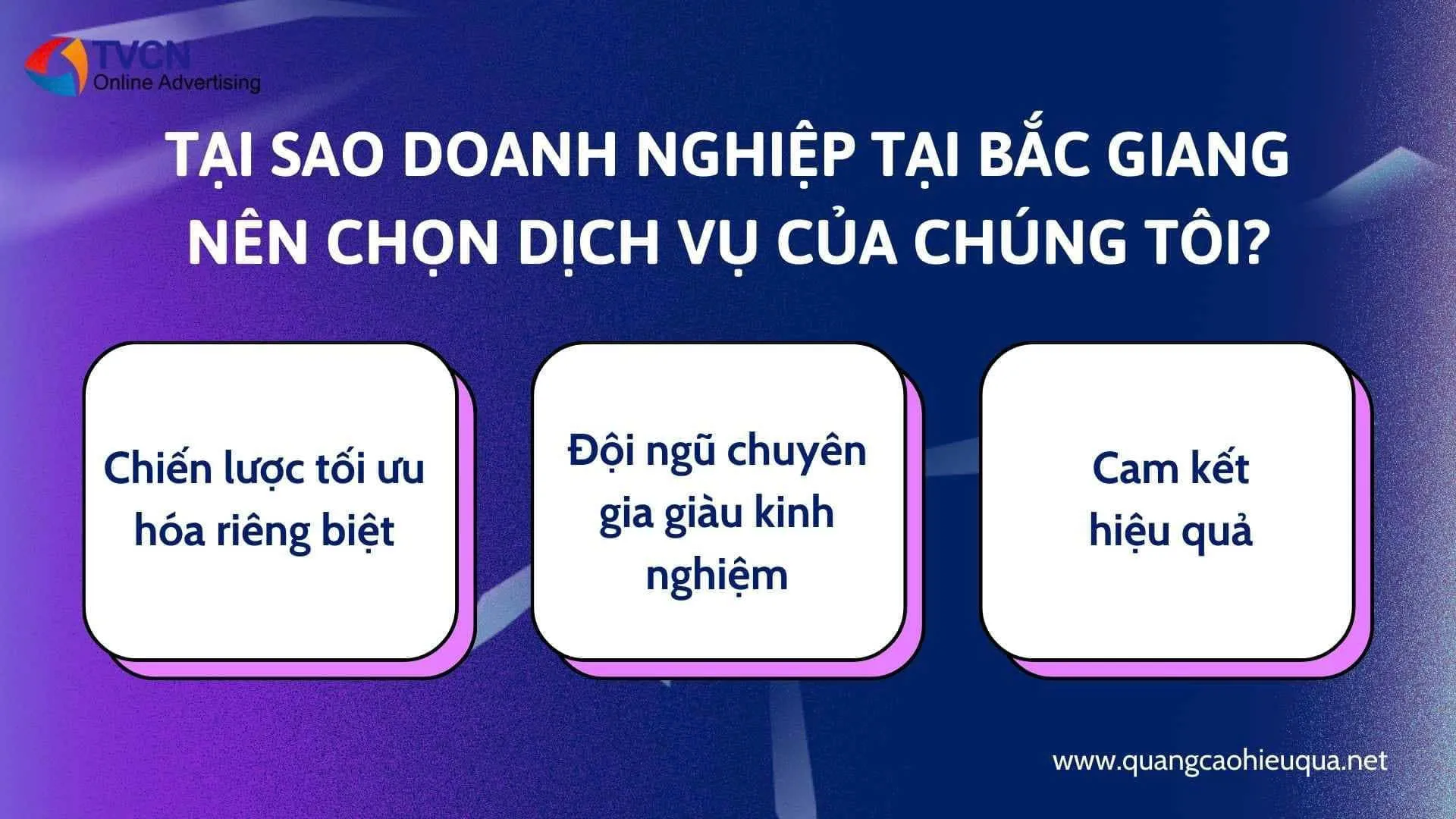 Nếu bạn đang tìm kiếm dịch vụ quảng cáo Facebook uy tín tại Bắc Giang, TVCN VIỆT NAM chắc chắn là đối tác đáng tin cậy. Hãy liên hệ với chúng tôi ngay hôm nay để bắt đầu chiến dịch quảng cáo hiệu quả và tối ưu hóa doanh thu của bạn.